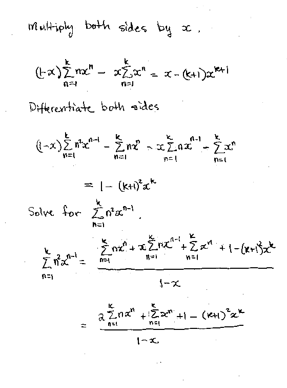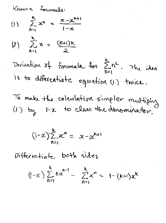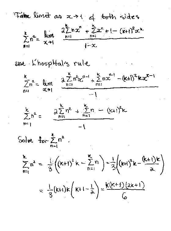 For extra credit derive the formula for a sum of cubes. One way of doing this is to modify the example below that derives the sum of squares.